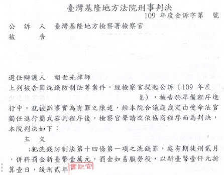 被告有貸款需求,在網路上得知民間辦理貸款之訊息,並與對方聯繫後,對方要求必須先寄出帳戶、提款卡及密碼,被告不疑有他寄出後,對方竟將該帳戶用以詐騙他人使用,因而遭基隆地檢署檢察官提起公訴,嗣被告委任胡律師後,經胡律師積極介入,出面與被害人協調成立調解,並與檢察官成立認罪協商,向法官爭取輕判及緩刑成功。